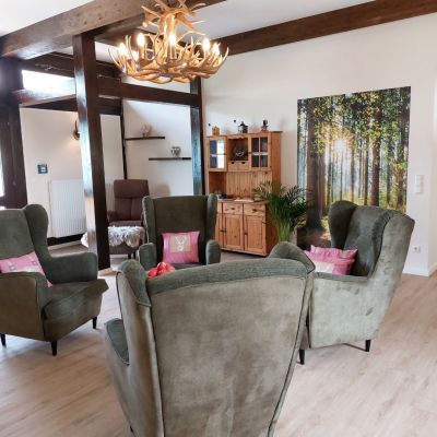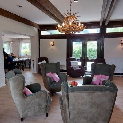 Im gemütlichen und stilvoll eingerichteten Wohnzimmer können sich die Bewohner treffen und austauschen. Diverse Sitzecken bieten im ganzen Haus die Möglichkeit, sich zurück zu ziehen ohne sich einsam zu fühlen.